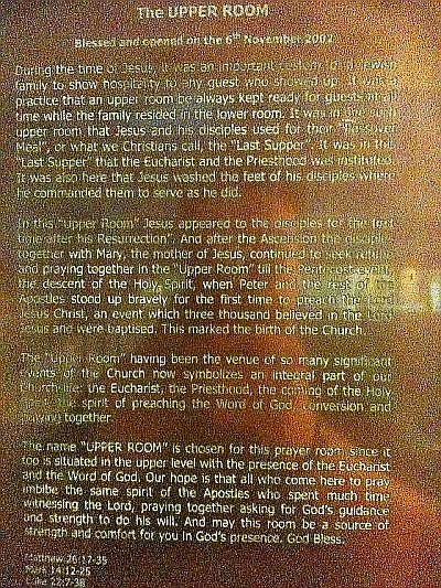 The “Upper Room” having been the venue of so many significant events of the Church now symbolizes the integral part of our Church life, the Eucharist, the Priesthood, the coming of the Holy Spirit, the spirit of preaching the Word of God, conversion and praying together.