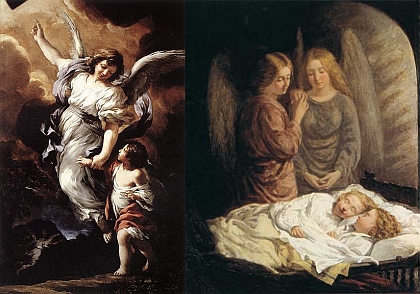 “From infancy to death human life is surrounded by their (the angels) watchful care and intercession. Beside each believer stands an angel as protector and shepherd leading him to life. Already here on earth the Christian life shares by faith in the blessed company of angels and men united to God.”