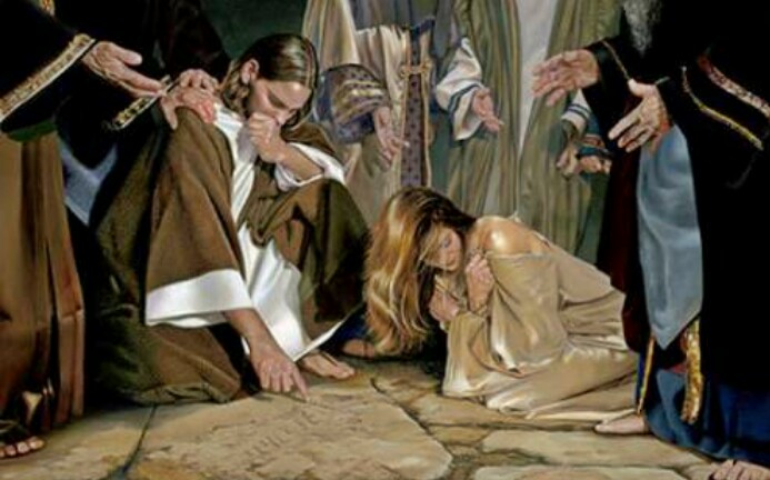 The scribes and Pharisees brought a woman along who had been caught committing adultery; and making her stand there in full view of everybody, they said to Jesus, ‘Master, this woman was caught in the very act of committing adultery, and Moses has ordered us in the Law to condemn women like this to death by stoning. What have you to say?’ They asked him this as a test, looking for something to use against him. But Jesus bent down and started writing on the ground with his finger. As they persisted with their question, he looked up and said, ‘If there is one of you who has not sinned, let him be the first to throw a stone at her.’ Then he bent down and wrote on the ground again. When they heard this they went away one by one, beginning with the eldest, until Jesus was left alone with the woman, who remained standing there. He looked up and said, ‘Woman, where are they? Has no one condemned you?’ ‘No one, sir’ she replied. ‘Neither do I condemn you,’ said Jesus ‘go away, and do not sin any more.’