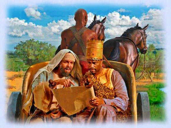 The angel of the Lord spoke to Philip saying, ‘Be ready to set out at noon along the road that goes from Jerusalem down to Gaza, the desert road.’ So he set off on his journey. Now it happened that an Ethiopian had been on pilgrimage to Jerusalem; he was a eunuch and an officer at the court of the kandake, or queen, of Ethiopia, and was in fact her chief treasurer. He was now on his way home; and as he sat in his chariot he was reading the prophet Isaiah. The Spirit said to Philip, ‘Go up and meet that chariot.’ When Philip ran up, he heard him reading Isaiah the prophet and asked, ‘Do you understand what you are reading?’ ‘How can I’ he replied ‘unless I have someone to guide me?’ So he invited Philip to get in and sit by his side. Now the passage of scripture he was reading was this: