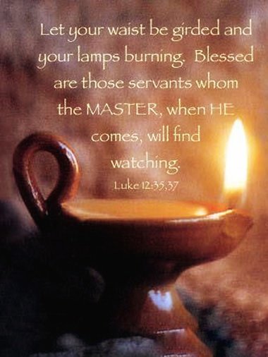 ‘See that you are dressed for action and have your lamps lit. Be like men waiting for their master to return from the wedding feast, ready to open the door as soon as he comes and knocks. Happy those servants whom the master finds awake when he comes. I tell you solemnly, he will put on an apron, sit them down at table and wait on them. It may be in the second watch he comes, or in the third, but happy those servants if he finds them ready.