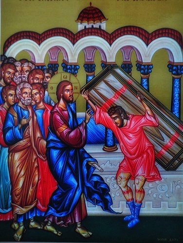 Jesus was teaching one day, and among the audience there were Pharisees and doctors of the Law who had come from every village in Galilee, from Judaea and from Jerusalem. And the Power of the Lord was behind his works of healing. Then some men appeared, carrying on a bed a paralysed man whom they were trying to bring in and lay down in front of him. But as the crowd made it impossible to find a way of getting him in, they went up on to the flat roof and lowered him and his stretcher down through the tiles into the middle of the gathering, in front of Jesus. Seeing their faith he said, ‘My friend, your sins are forgiven you.’ The scribes and the Pharisees began to think this over. ‘Who is this man talking blasphemy? Who can forgive sins but God alone?’ But Jesus, aware of their thoughts, made them this reply, ‘What are these thoughts you have in your hearts? Which of these is easier: to say, “Your sins are forgiven you” or to say, “Get up and walk”? But to prove to you that the Son of Man has authority on earth to forgive sins,’– he said to the paralysed man– ‘I order you: get up, and pick up your stretcher and go home.’ And immediately before their very eyes he got up, picked up what he had been lying on and went home praising God.