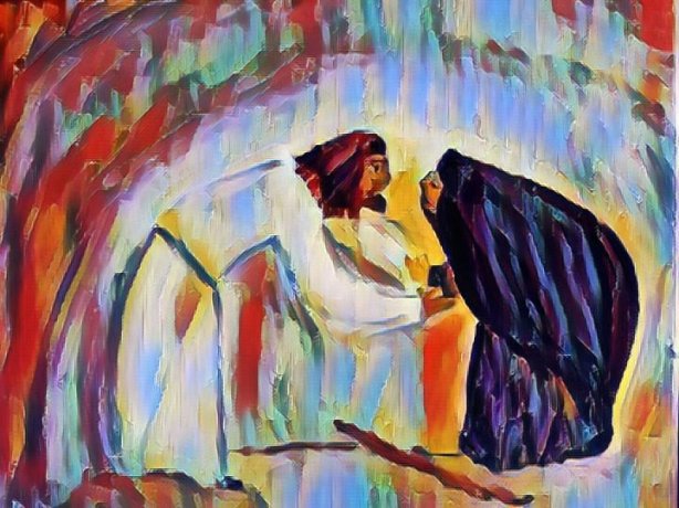One sabbath day Jesus was teaching in one of the synagogues, and a woman was there who for eighteen years had been possessed by a spirit that left her enfeebled; she was bent double and quite unable to stand upright. When Jesus saw her he called her over and said, ‘Woman, you are rid of your infirmity’ and he laid his hands on her. And at once she straightened up, and she glorified God.