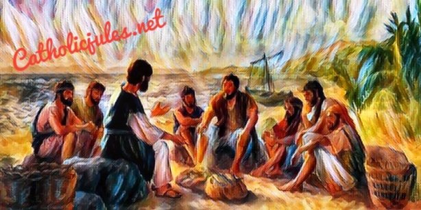 It was light by now and there stood Jesus on the shore, though the disciples did not realise that it was Jesus. Jesus called out, ‘Have you caught anything, friends?’ And when they answered, ‘No’, he said, ‘Throw the net out to starboard and you’ll find something.’ So they dropped the net, and there were so many fish that they could not haul it in. The disciple Jesus loved said to Peter, ‘It is the Lord.’ At these words ‘It is the Lord’, Simon Peter, who had practically nothing on, wrapped his cloak round him and jumped into the water. The other disciples came on in the boat, towing the net and the fish; they were only about a hundred yards from land.