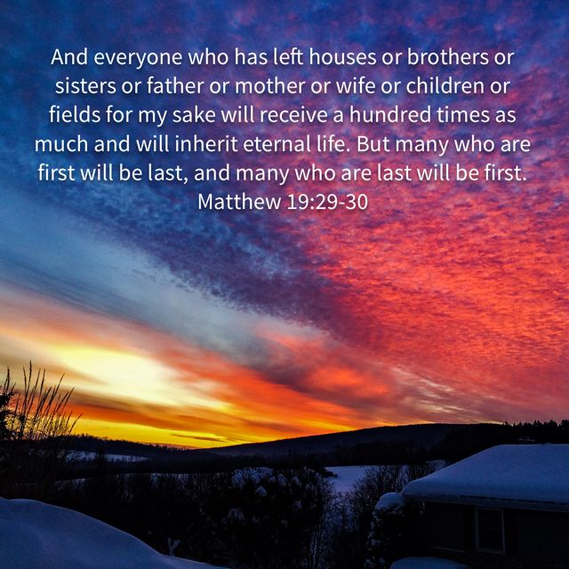Then Peter spoke. ‘What about us?’ he said to him ‘We have left everything and followed you. What are we to have, then?’ Jesus said to him, ‘I tell you solemnly, when all is made new and the Son of Man sits on his throne of glory, you will yourselves sit on twelve thrones to judge the twelve tribes of Israel. And everyone who has left houses, brothers, sisters, father, mother, children or land for the sake of my name will be repaid a hundred times over, and also inherit eternal life.
