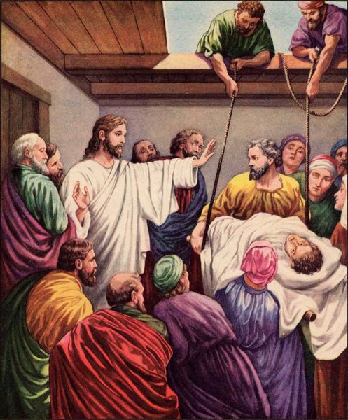 When Jesus returned to Capernaum, word went round that he was back; and so many people collected that there was no room left, even in front of the door. He was preaching the word to them when some people came bringing him a paralytic carried by four men, but as the crowd made it impossible to get the man to him, they stripped the roof over the place where Jesus was; and when they had made an opening, they lowered the stretcher on which the paralytic lay. Seeing their faith, Jesus said to the paralytic, ‘My child, your sins are forgiven.’ Now some scribes were sitting there, and they thought to themselves, ‘How can this man talk like that? He is blaspheming. Who can forgive sins but God?’ Jesus, inwardly aware that this was what they were thinking, said to them, ‘Why do you have these thoughts in your hearts? Which of these is easier: to say to the paralytic, “Your sins are forgiven” or to say, “Get up, pick up your stretcher and walk”? But to prove to you that the Son of Man has authority on earth to forgive sins,’ – he turned to the paralytic – ‘I order you: get up, pick up your stretcher, and go off home.’ And the man got up, picked up his stretcher at once and walked out in front of everyone, so that they were all astounded and praised God saying, ‘We have never seen anything like this.’