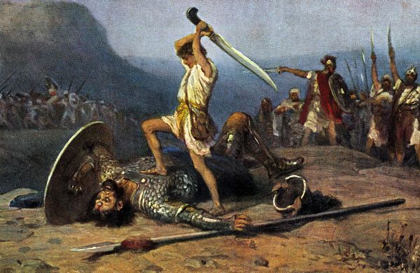 No sooner had the Philistine started forward to confront David than David left the line of battle and ran to meet the Philistine. Putting his hand in his bag, he took out a stone and slung it and struck the Philistine on the forehead; the stone penetrated his forehead and he fell on his face to the ground. Thus David triumphed over the Philistine with a sling and a stone and struck the Philistine down and killed him. David had no sword in his hand. Then David ran and, standing over the Philistine, seized his sword and drew it from the scabbard, and with this he killed him, cutting off his head. The Philistines saw that their champion was dead, and took to flight.