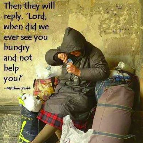 ‘Next he will say to those on his left hand, “Go away from me, with your curse upon you, to the eternal fire prepared for the devil and his angels. For I was hungry and you never gave me food; I was thirsty and you never gave me anything to drink; I was a stranger and you never made me welcome, naked and you never clothed me, sick and in prison and you never visited me.” Then it will be their turn to ask, “Lord, when did we see you hungry or thirsty, a stranger or naked, sick or in prison, and did not come to your help?” Then he will answer, “I tell you solemnly, in so far as you neglected to do this to one of the least of these, you neglected to do it to me.”
