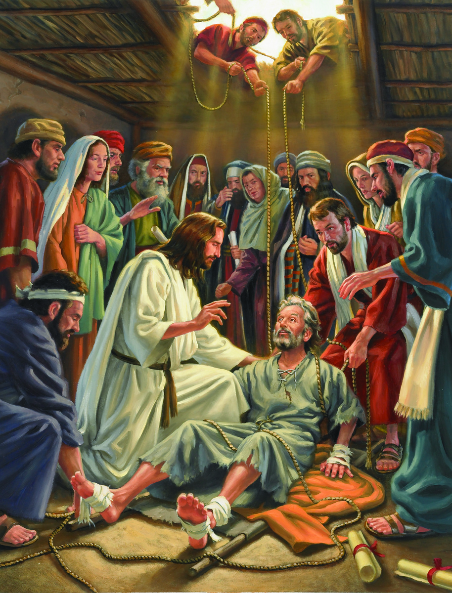 When Jesus returned to Capernaum, word went round that he was back; and so many people collected that there was no room left, even in front of the door. He was preaching the word to them when some people came bringing him a paralytic carried by four men, but as the crowd made it impossible to get the man to him, they stripped the roof over the place where Jesus was; and when they had made an opening, they lowered the stretcher on which the paralytic lay. Seeing their faith, Jesus said to the paralytic, ‘My child, your sins are forgiven.’ Now some scribes were sitting there, and they thought to themselves, ‘How can this man talk like that? He is blaspheming. Who can forgive sins but God?’ Jesus, inwardly aware that this was what they were thinking, said to them, ‘Why do you have these thoughts in your hearts? Which of these is easier: to say to the paralytic, “Your sins are forgiven” or to say, “Get up, pick up your stretcher and walk”? But to prove to you that the Son of Man has authority on earth to forgive sins,’ – he turned to the paralytic – ‘I order you: get up, pick up your stretcher, and go off home.’ And the man got up, picked up his stretcher at once and walked out in front of everyone, so that they were all astounded and praised God saying, ‘We have never seen anything like this.’