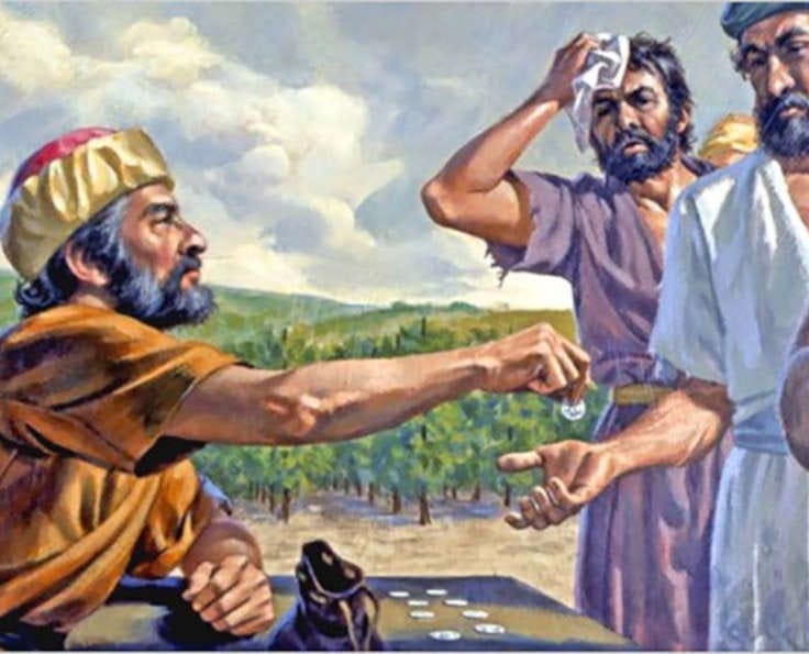 Jesus said to his disciples: ‘The kingdom of heaven is like a landowner going out at daybreak to hire workers for his vineyard. He made an agreement with the workers for one denarius a day, and sent them to his vineyard. Going out at about the third hour he saw others standing idle in the market place and said to them, “You go to my vineyard too and I will give you a fair wage.” So they went. At about the sixth hour and again at about the ninth hour, he went out and did the same. Then at about the eleventh hour he went out and found more men standing round, and he said to them, “Why have you been standing here idle all day?” “Because no one has hired us” they answered. He said to them, “You go into my vineyard too.” In the evening, the owner of the vineyard said to his bailiff, “Call the workers and pay them their wages, starting with the last arrivals and ending with the first.” So those who were hired at about the eleventh hour came forward and received one denarius each. When the first came, they expected to get more, but they too received one denarius each. They took it, but grumbled at the landowner. “The men who came last” they said “have done only one hour, and you have treated them the same as us, though we have done a heavy day’s work in all the heat.” He answered one of them and said, “My friend, I am not being unjust to you; did we not agree on one denarius? Take your earnings and go. I choose to pay the last comer as much as I pay you. Have I no right to do what I like with my own? Why be envious because I am generous?” Thus the last will be first, and the first, last.’
