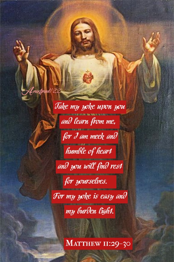 ‘Come to me, all you who labour and are overburdened, and I will give you rest. Shoulder my yoke and learn from me, for I am gentle and humble in heart, and you will find rest for your souls. Yes, my yoke is easy and my burden light.’