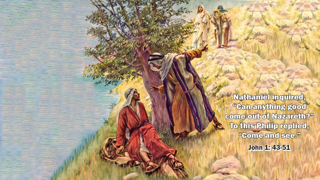 After Jesus had decided to leave for Galilee, he met Philip and said, ‘Follow me.’ Philip came from the same town, Bethsaida, as Andrew and Peter. Philip found Nathanael and said to him, ‘We have found the one Moses wrote about in the Law, the one about whom the prophets wrote: he is Jesus son of Joseph, from Nazareth.’ ‘From Nazareth?’ said Nathanael ‘Can anything good come from that place?’ ‘Come and see’ replied Philip. When Jesus saw Nathanael coming he said of him, ‘There is an Israelite who deserves the name, incapable of deceit.’ ‘How do you know me?’ said Nathanael. ‘Before Philip came to call you,’ said Jesus ‘I saw you under the fig tree.’ Nathanael answered, ‘Rabbi, you are the Son of God, you are the King of Israel.’ Jesus replied, ‘You believe that just because I said: I saw you under the fig tree. You will see greater things than that.’ And then he added ‘I tell you most solemnly, you will see heaven laid open and, above the Son of Man, the angels of God ascending and descending.’