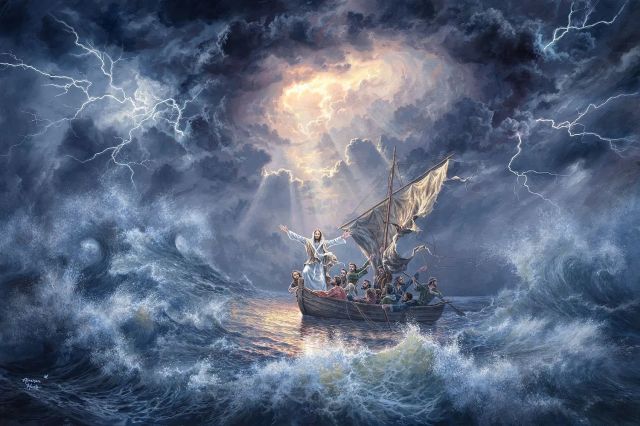 With the coming of evening, Jesus said to his disciples, ‘Let us cross over to the other side.’ And leaving the crowd behind they took him, just as he was, in the boat; and there were other boats with him. Then it began to blow a gale and the waves were breaking into the boat so that it was almost swamped. But he was in the stern, his head on the cushion, asleep. They woke him and said to him, ‘Master, do you not care? We are going down!’ And he woke up and rebuked the wind and said to the sea, ‘Quiet now! Be calm!’ And the wind dropped, and all was calm again. Then he said to them, ‘Why are you so frightened? How is it that you have no faith?’ They were filled with awe and said to one another, ‘Who can this be? Even the wind and the sea obey him.’