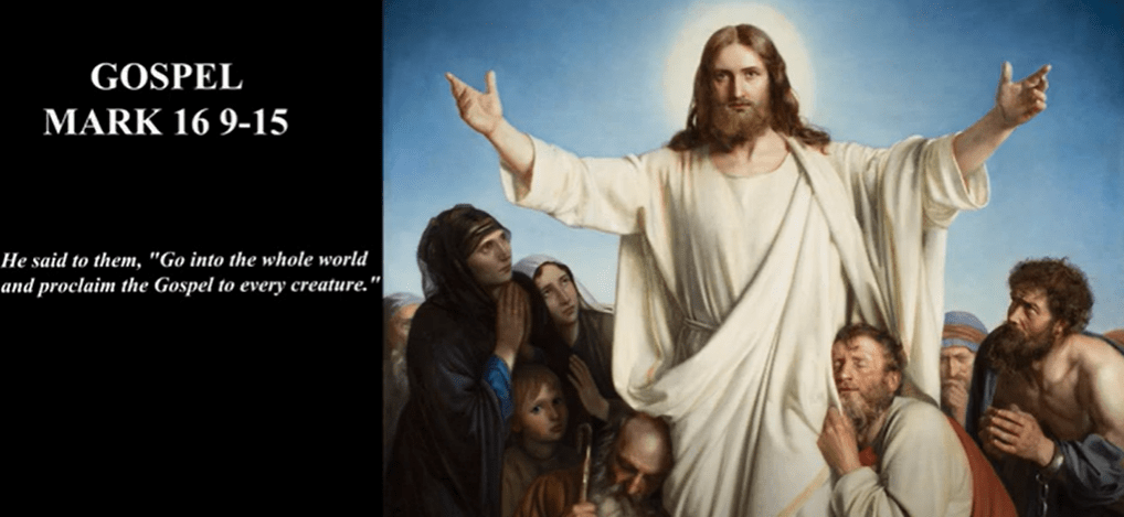 Lastly, he showed himself to the Eleven themselves while they were at table. He reproached them for their incredulity and obstinacy, because they had refused to believe those who had seen him after he had risen. And he said to them, ‘Go out to the whole world; proclaim the Good News to all creation.’