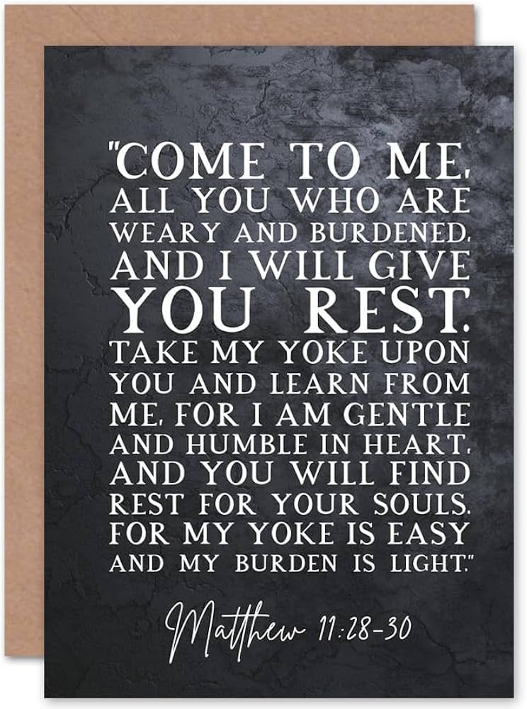 Jesus said, ‘Come to me, all you who labour and are overburdened, and I will give you rest. Shoulder my yoke and learn from me, for I am gentle and humble in heart, and you will find rest for your souls. Yes, my yoke is easy and my burden light.’