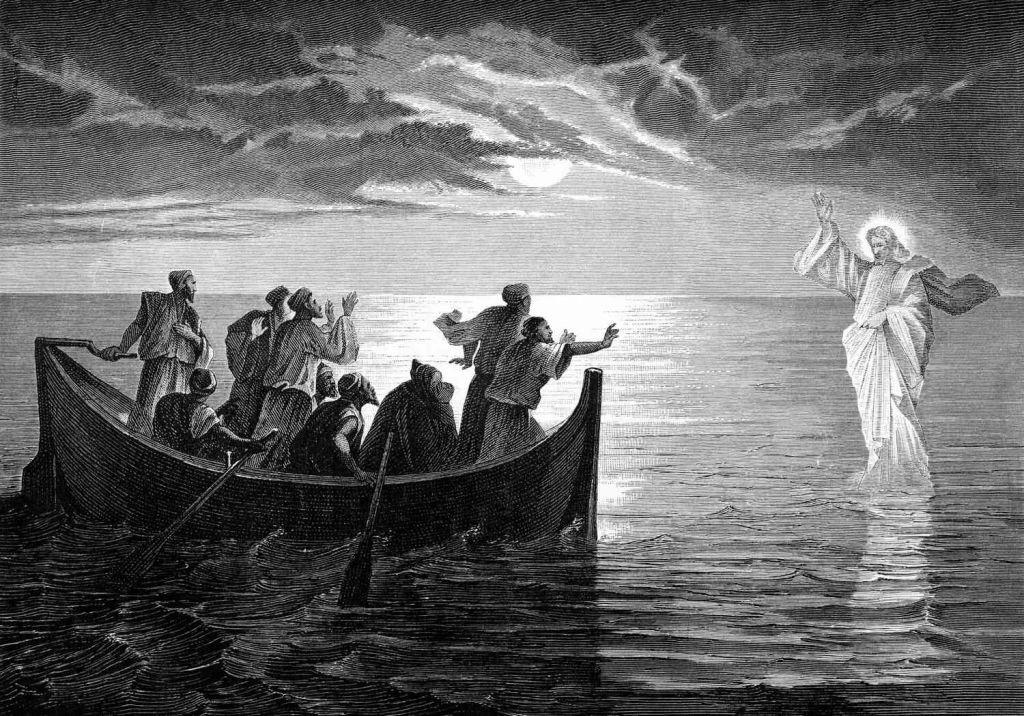 After the five thousand had eaten and were filled, Jesus made his disciples get into the boat and go on ahead to Bethsaida, while he himself sent the crowd away. After saying goodbye to them he went off into the hills to pray. When evening came, the boat was far out on the lake, and he was alone on the land. He could see they were worn out with rowing, for the wind was against them; and about the fourth watch of the night he came towards them, walking on the lake. He was going to pass them by, but when they saw him walking on the lake they thought it was a ghost and cried out; for they had all seen him and were terrified. But he at once spoke to them, and said, ‘Courage! It is I! Do not be afraid.’ Then he got into the boat with them, and the wind dropped. They were utterly and completely dumbfounded, because they had not seen what the miracle of the loaves meant; their minds were closed.
