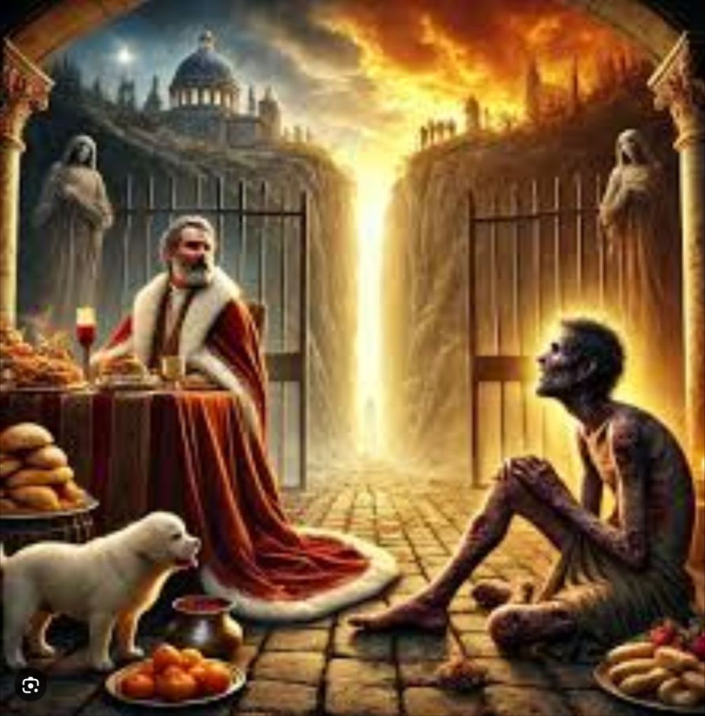 Jesus said to the Pharisees: ‘There was a rich man who used to dress in purple and fine linen and feast magnificently every day. And at his gate there lay a poor man called Lazarus, covered with sores, who longed to fill himself with the scraps that fell from the rich man’s table. Dogs even came and licked his sores. Now the poor man died and was carried away by the angels to the bosom of Abraham. The rich man also died and was buried.