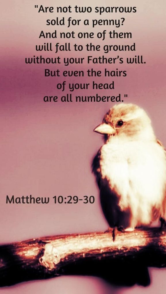 ‘Do not be afraid of those who kill the body but cannot kill the soul; fear him rather who can destroy both body and soul in hell. Can you not buy two sparrows for a penny? And yet not one falls to the ground without your Father knowing. Why, every hair on your head has been counted. So there is no need to be afraid; you are worth more than hundreds of sparrows.