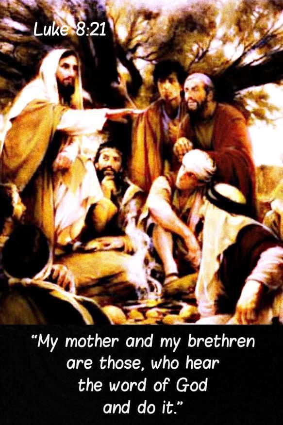The mother and the brothers of Jesus came looking for him, but they could not get to him because of the crowd. He was told, ‘Your mother and brothers are standing outside and want to see you.’ But he said in answer, ‘My mother and my brothers are those who hear the word of God and put it into practice.’