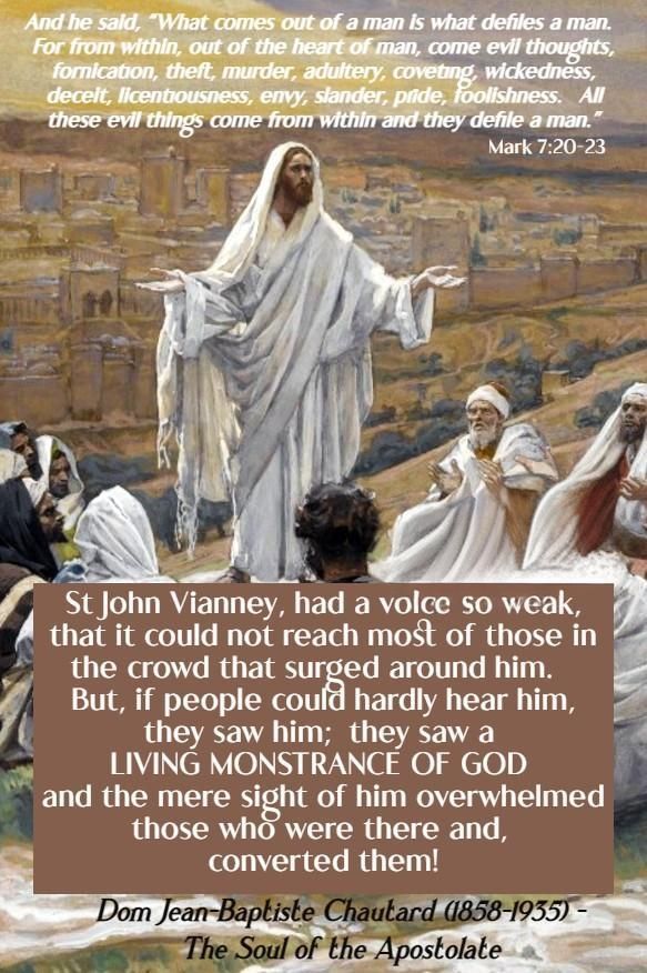 When he had gone back into the house, away from the crowd, his disciples questioned him about the parable. He said to them, ‘Do you not understand either? Can you not see that whatever goes into a man from outside cannot make him unclean, because it does not go into his heart but through his stomach and passes out into the sewer?’ (Thus he pronounced all foods clean.) And he went on, ‘It is what comes out of a man that makes him unclean. For it is from within, from men’s hearts, that evil intentions emerge: fornication, theft, murder, adultery, avarice, malice, deceit, indecency, envy, slander, pride, folly. All these evil things come from within and make a man unclean.’