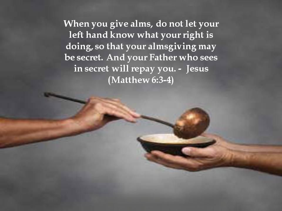 Jesus said to his disciples: ‘Be careful not to parade your good deeds before men to attract their notice; by doing this you will lose all reward from your Father in heaven. So when you give alms, do not have it trumpeted before you; this is what the hypocrites do in the synagogues and in the streets to win men’s admiration. I tell you solemnly, they have had their reward. But when you give alms, your left hand must not know what your right is doing; your almsgiving must be secret, and your Father who sees all that is done in secret will reward you.