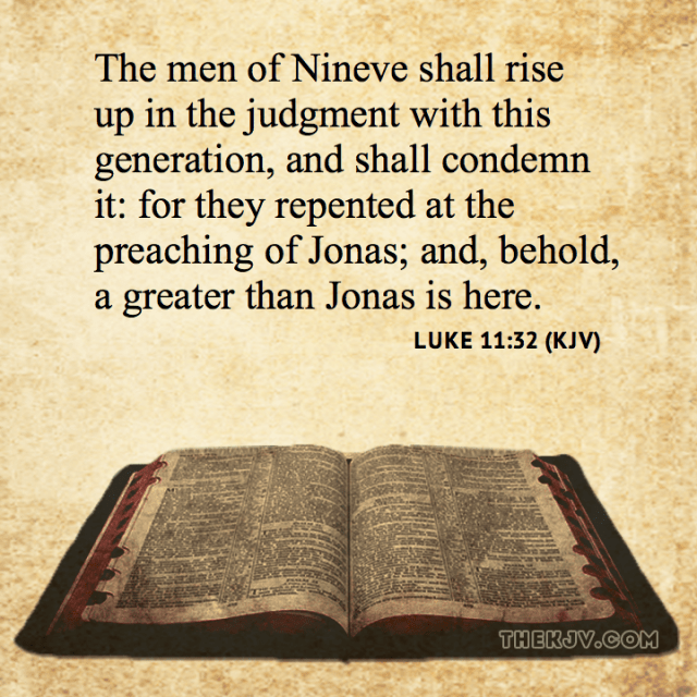 ‘This is a wicked generation; it is asking for a sign. The only sign it will be given is the sign of Jonah. For just as Jonah became a sign to the Ninevites, so will the Son of Man be to this generation. On Judgement day the Queen of the South will rise up with the men of this generation and condemn them, because she came from the ends of the earth to hear the wisdom of Solomon; and there is something greater than Solomon here. On Judgement day the men of Nineveh will stand up with this generation and condemn it, because when Jonah preached they repented; and there is something greater than Jonah here.’